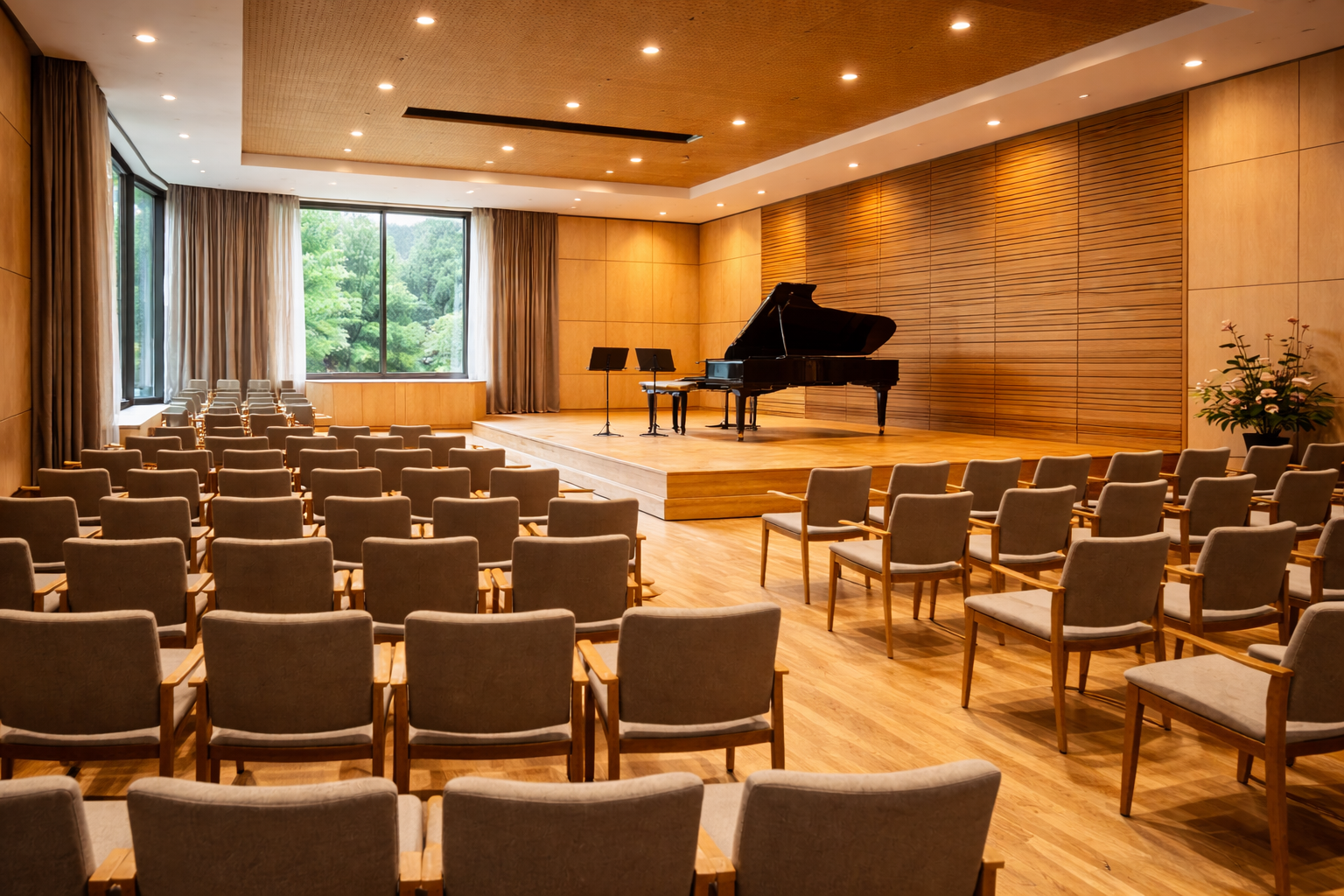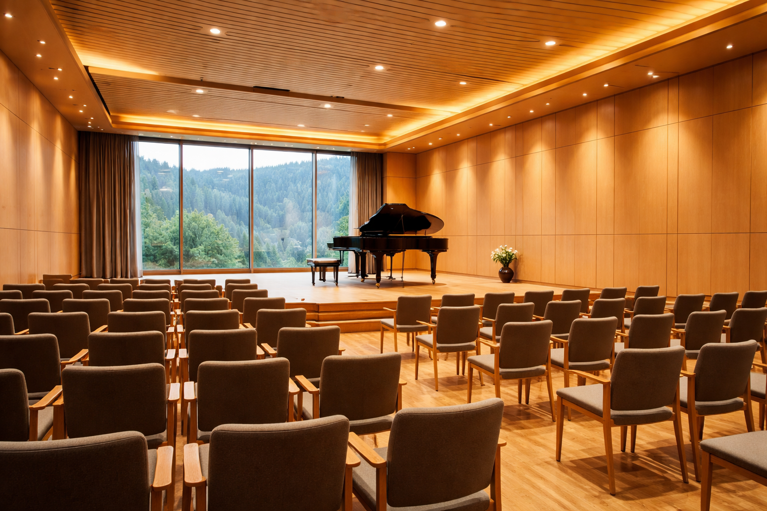 Der kleinere Saal bietet Platz für etwa 200 Personen und ist vielseitig nutzbar – für Kammerkonzerte, Lesungen, Tagungen und Seminare. Helle Birkenholzverkleidungen, variable Bestuhlung und moderne Medientechnik schaffen ein flexibles Ambiente. Eine große Fensterfront öffnet den Blick auf die umliegende Landschaft und bringt Tageslicht ins Innere.