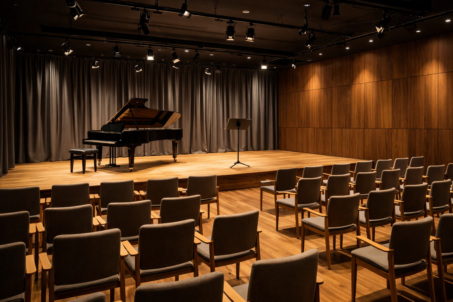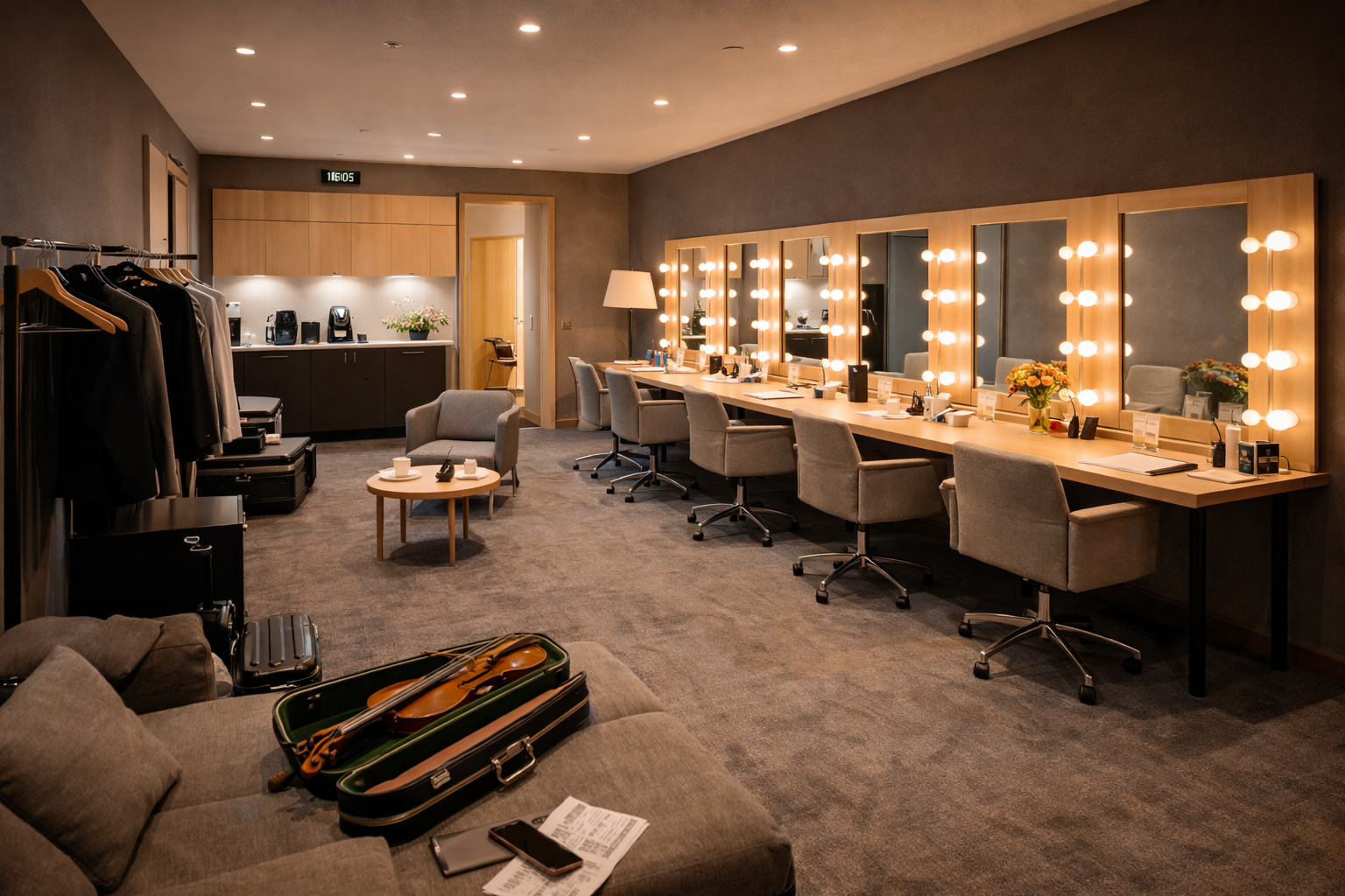 Der Backstage-Bereich umfasst Garderoben, Technikräume und eine direkte Anbindung an die Bühne über einen Lastenaufzug. Zwei große Künstlergarderoben sowie kleinere Einzelräume stehen für Solist:innen und Ensembles zur Verfügung. Schlichte Farben, gute Beleuchtung und funktionale Möbel sorgen für eine ruhige Arbeitsumgebung.