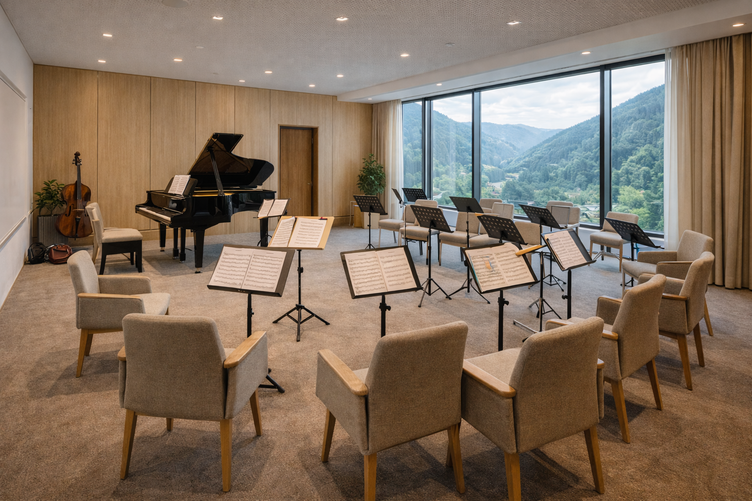 Im Obergeschoss befinden sich mehrere Seminar- und Proberäume, die mit schallisolierten Wänden und moderner Technik ausgestattet sind. Hier proben regelmäßig die Blaskapelle Fichtental und verschiedene Chöre. Die Räume sind schlicht, hell und funktional gestaltet – mit Holz- und Stoffelementen, die für eine angenehme Akustik sorgen.